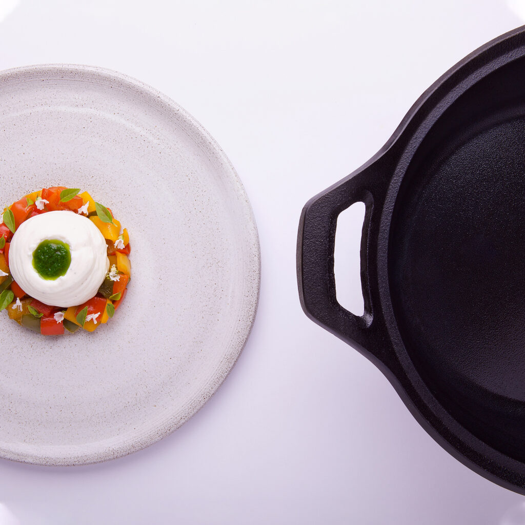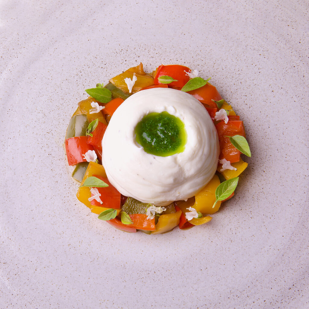 “In questa ricetta utilizzo dei peperoni che danno colore e un sapore vegetale al piatto, una ricotta che dona grassezza e rotondità alla preparazione e una crema di basilico per rinfrescare il tutto con il caratteristico profumo di questa erba aromatica. “